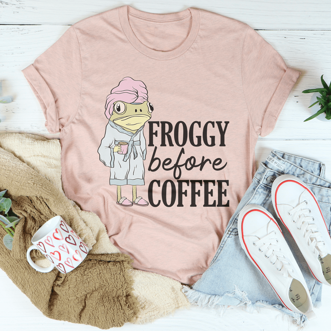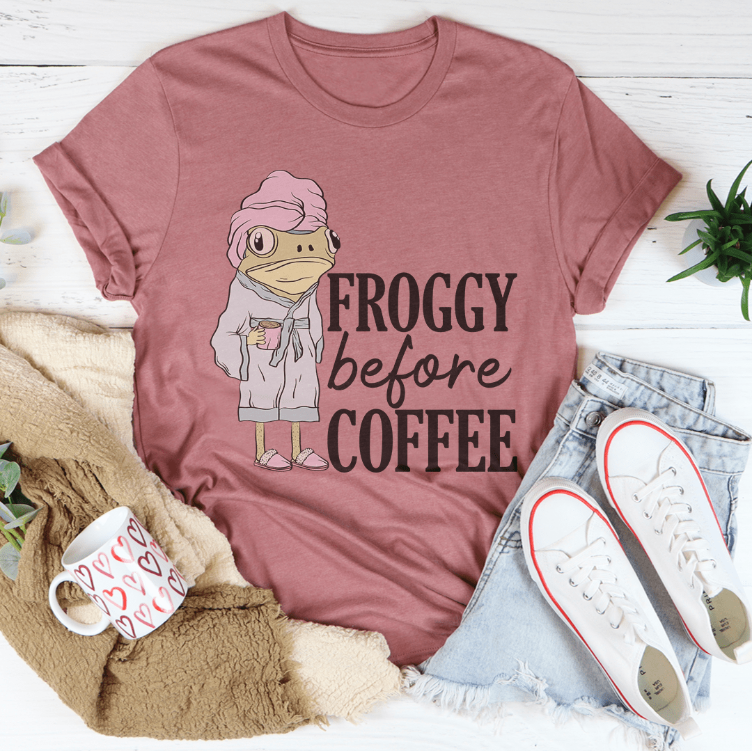 Hop into your day with a bit of humor with our "Froggy Before Coffee" T-shirt. This playful tee is perfect for coffee lovers and morning people (or rather, non-morning people) who need that first cup to get going. It's a lighthearted way to show off your need for caffeine with a smile.