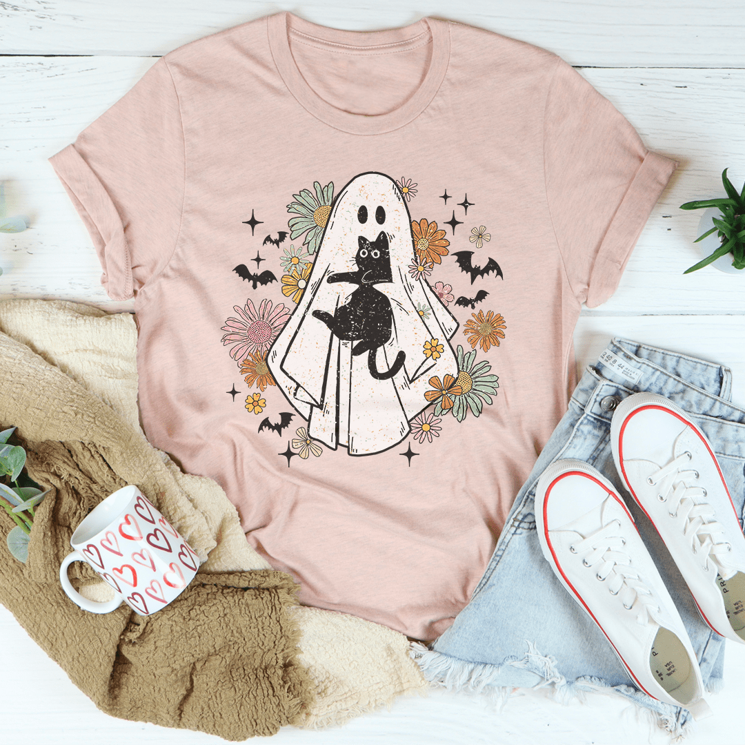 Made from lightweight, breathable material, this shirt is designed for comfort, whether you're trick-or-treating, attending a Halloween party, or just enjoying a spooky movie marathon at home. The charming graphic of a ghostly black cat adds a playful yet eerie touch to any casual outfit.