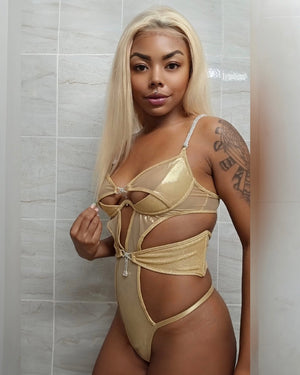 Lurex yarn knit and metallic shimmer mesh, Demi cup with underwire, Rhinestone bow hardware and trim, Steel boning, Hook and eye closure, Single string Thong Style Back