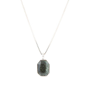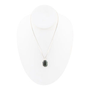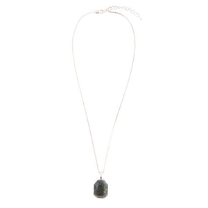 Indulge in the stunning beauty of this handcrafted pendant necklace, featuring a Genuine hammered green seraphinite stone set in a sterling silver bezel. The vibrant green hues of the stone are perfectly complemented by the hammered silver, creating a unique and eye-catching piece. Measuring 1.2" in length from the bale and weighing 12 grams, this necklace is finished with a 17" chain and a 2" extender for the perfect fit. Add a touch of elegance and style to your wardrobe with this expertly crafted necklace.