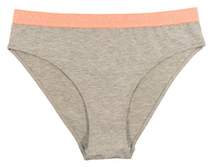 - Breathable high-waist heather gray cotton with a pink shimmery elastic waistband
