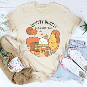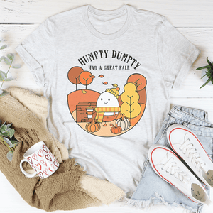 Embrace the autumn season with a twist of humor in our "Humpty Dumpty Had a Great Fall" T-shirt. This playful tee takes a classic nursery rhyme and spins it into a fall-themed joke, perfect for anyone who loves to celebrate the season with a bit of whimsy and warmth.