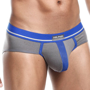 The Hung Race Brief is the ultimate comfort option for men who lead busy and hectic lives. Men's brief underwear is constructed from a blend of cotton, spandex, and polyamide for a comfortable and breathable fit. The pouch section is made from a patch of mesh fabric that provides ventilation and the contrast color piping adds a touch of style. The contoured pouch of men's enhancing underwear supports and protects your jewels, making it perfect for day-to-day activities as well as fitness. The stretchy cotton fabric provides the complete coverage to the cheeks and hold them at a place to visible under the pants. The spandex and polyamide material provides stretchability and a full range of motion. The thin wrinkle-free waistband features the brand logo and the men's sexy brief is suitable for any occasion. Whether you're running errands or hitting the gym, the Hung Race Brief is the perfect choice for ultimate comfort and support.