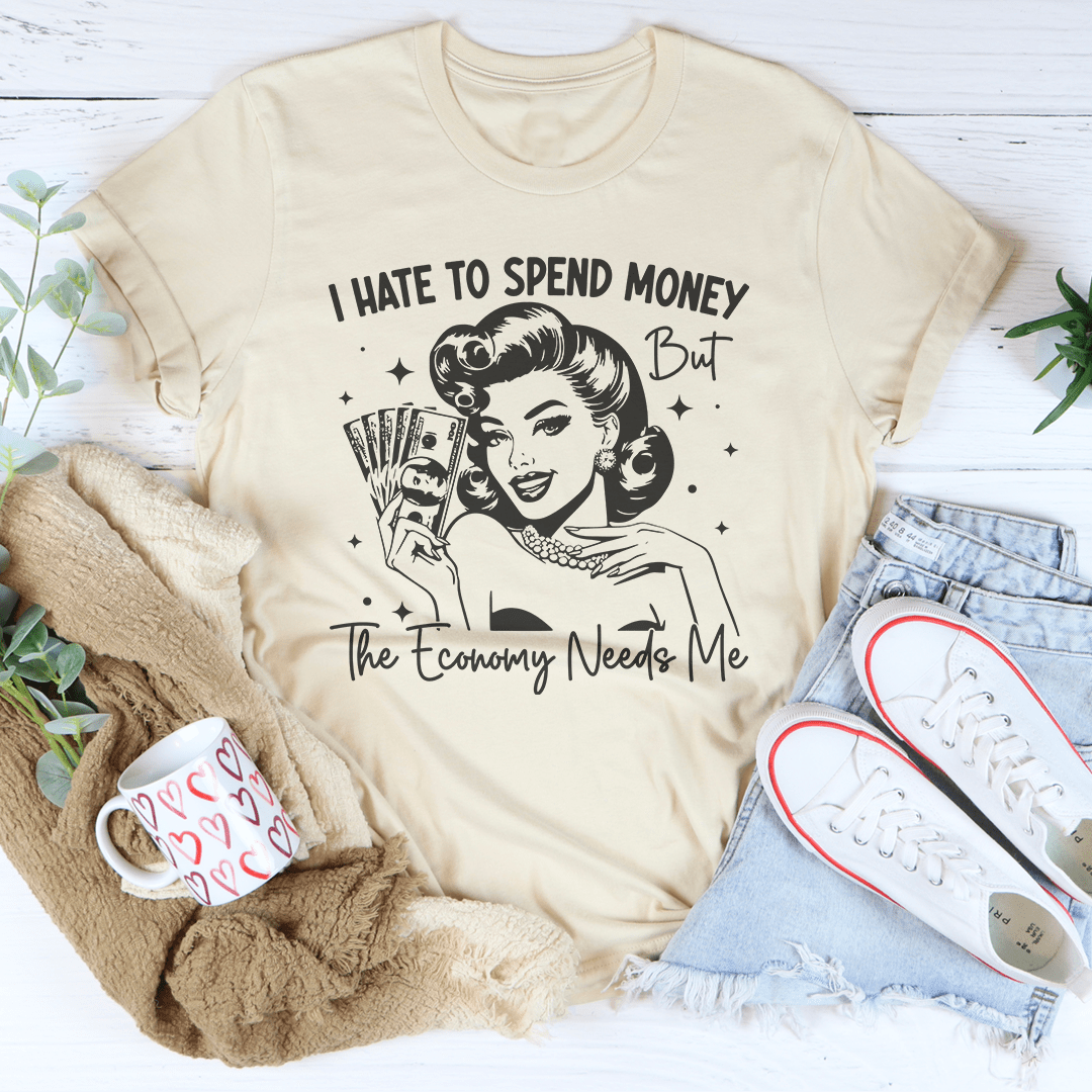 Show off your playful take on personal finance with this witty women's T-shirt that reads, "I Hate To Spend Money But The Economy Needs Me." It’s perfect for anyone who loves a bit of retail therapy and understands the importance of a little humor in their spending habits.