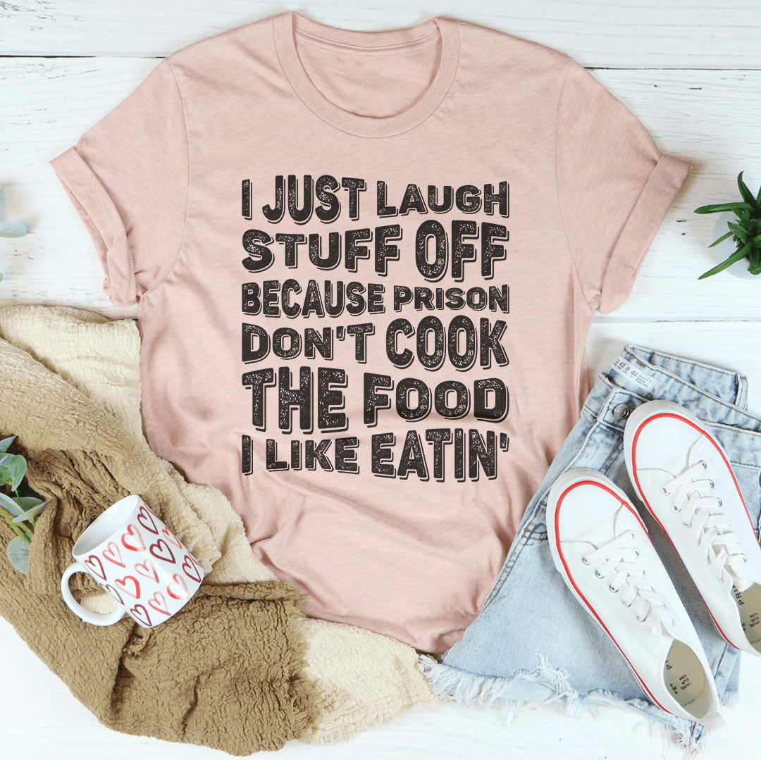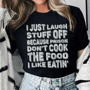 Well, honey, have we got a solution for you! Slip on our "I Just Laugh Stuff Off Because Prison Don't Cook The Food I Like Eatin" tee. Just like your favorite finger-lickin' good home-cooked meal, this tee is comfort with a capital 'C', doused in a hot serving of sass.