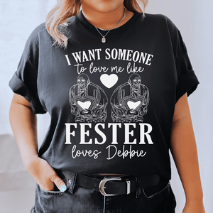 Introducing our "I Want Someone To Love Me Like Fester Loves Debbie" statement tee! For fans of the delightfully dark, and a little bit twisted, this shirt plays a tribute to the peculiar pair's iconic love.