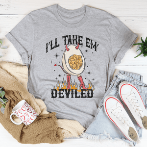 Feel the eggshell-soft texture against your skin—so comfortable it’ll have you scrambling for more. The sizzling graphics add just the right pinch of spice to your wardrobe, perfectly whipped for those who aren't afraid to crack a joke. From backyard barbecues to casual Fridays, this shirt is your secret recipe for a sunny disposition. So, put on your "I'll Take 'Em Deviled" tee, egg-cite your friends, and whisk yourself into a world of comfort that's as tempting as a plate of deviled eggs!