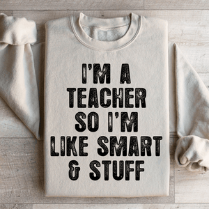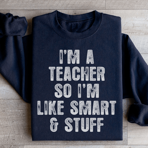 The sweatshirt boasts the amusing phrase "I'm A Teacher So I'm Like Smart And Stuff" in a fun, friendly font. It's a lighthearted way to show off your pride in your profession and your sense of humor. Whether you're grading papers, attending staff meetings, or enjoying some well-deserved downtime, this sweatshirt is sure to bring smiles and nods of appreciation.