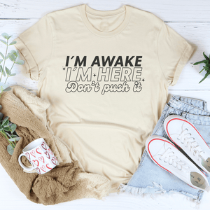 Start your day with a dose of honesty in the "I'm Awake, I'm Here, Don't Push It" t-shirt. Perfect for those mornings when coffee isn’t enough, this tee speaks for you when you’re not ready to speak for yourself. It’s all about setting boundaries with a hint of humor.