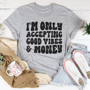 Hey girl, it's time to amp up your wardrobe with our totes adorbs "I'm Only Accepting Good Vibes & Money" tee from our online graphic tee boutique! This ultra-chic tee is perfect for ladies who love to make a statement with a cheeky twist. Crafted with top-notch materials, this women's graphic tee is all about comfy vibes, lasting wear, and looking fab – seriously, you NEED this in your closet! Check out why this cool shirt for women is a must-have:
