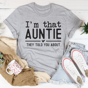 Embrace your role as the fun, fashionable family member with this playful women’s T-shirt that proudly declares, "I'm That Auntie They Told You About." It's perfect for the aunt who loves to spoil, entertain, and bring a little extra joy to every family gathering.