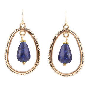 Transform your look with these handcrafted Inline Blue Lapis Drop Golden Earrings. The vibrant blue lapis stone adds a pop of color to the semi-oval golden brass design. Measuring 1.75" in length and 1" at its widest point, these earrings are sure to make a statement. Crafted and finished by hand with a total weight of 11.5g, they are a unique and elegant addition to any collection. Enhance your style and feel the passion in every detail of these earrings.