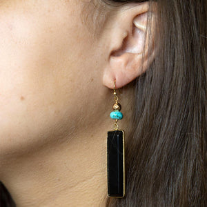 Experience the ultimate in elegance and style with these stunning Jett Black Onyx Linear Golden Drop Earrings. Crafted and finished by hand, these earrings feature a beautiful magnesite circled stone and a sleek black onyx rectangular stone. Measuring 2.75" in length and .5" at its widest point, these earrings are the perfect accessory for any occasion. Indulge in the luxurious weight of 16.8g and elevate your look with these exquisite earrings.