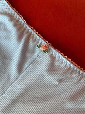Our Lady Shorts are the best! High waisted and so comfy. Made with ultra soft viscose brushed rib fabric. Trimmed with contrast picot elastic and a sweet vintage inspired rosette at center. Slightly cheeky at back. Pair with the matching Bralette!