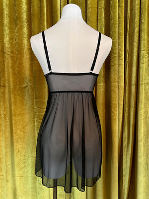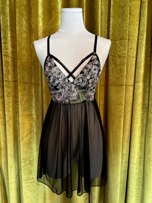 The sweetest babydoll style! Hydrangea embroidery made with a black sheer mesh base at top and stretch mesh at the skirt. Adjustable straps, and adjustable picot elastic trim at neckline. Hook and eye at back closure.