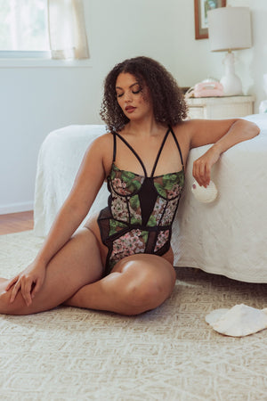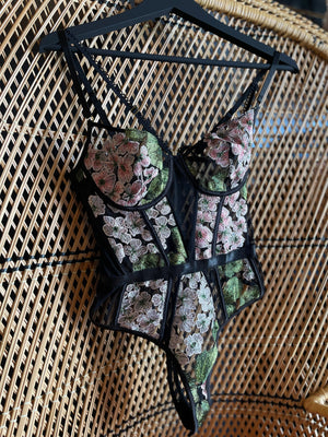 Our most loved bodysuit style re-imagined in a Hydrangea embroidery made with a black sheer mesh base. Trimmed with satin. Thong at back. Snaps at gusset. Underwire cups, adjustable straps, hook and eye at back closure.