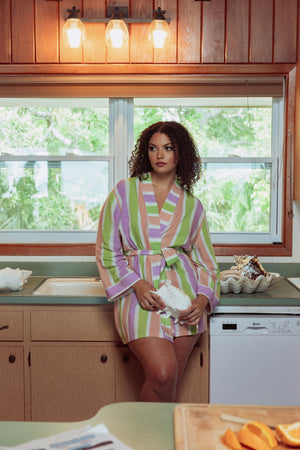 Short Robe made our new lightweight woven 100% cotton fabric. Digitally printed with our Painted Stripe print. This new style features pockets and wide bands at front opening and cuffs.