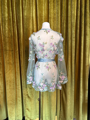 Short Robe made with fully embroidered sheer powder blue mesh. Multicolor florals and pearls. Scalloped edges. Trimmed with satin at front opening and self-belted tie.