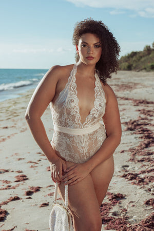 One of our bestselling styles- the Lace Teddy. Made with shimmery stretch floral lace. Plunging neckline, wide elastic at waist, and cheeky bottom. Satin ribbon halter ties at neck.
