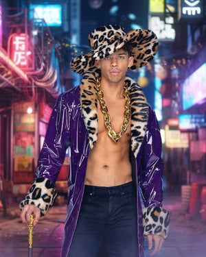 Transform into royalty with our King Pimp Costume! This lavish ensemble features a floor-length vinyl coat adorned with faux fur lapels and cuffs, complemented by a luxurious faux fur hat. Perfect for Halloween or themed parties, exude extravagance and elegance in this regal outfit.