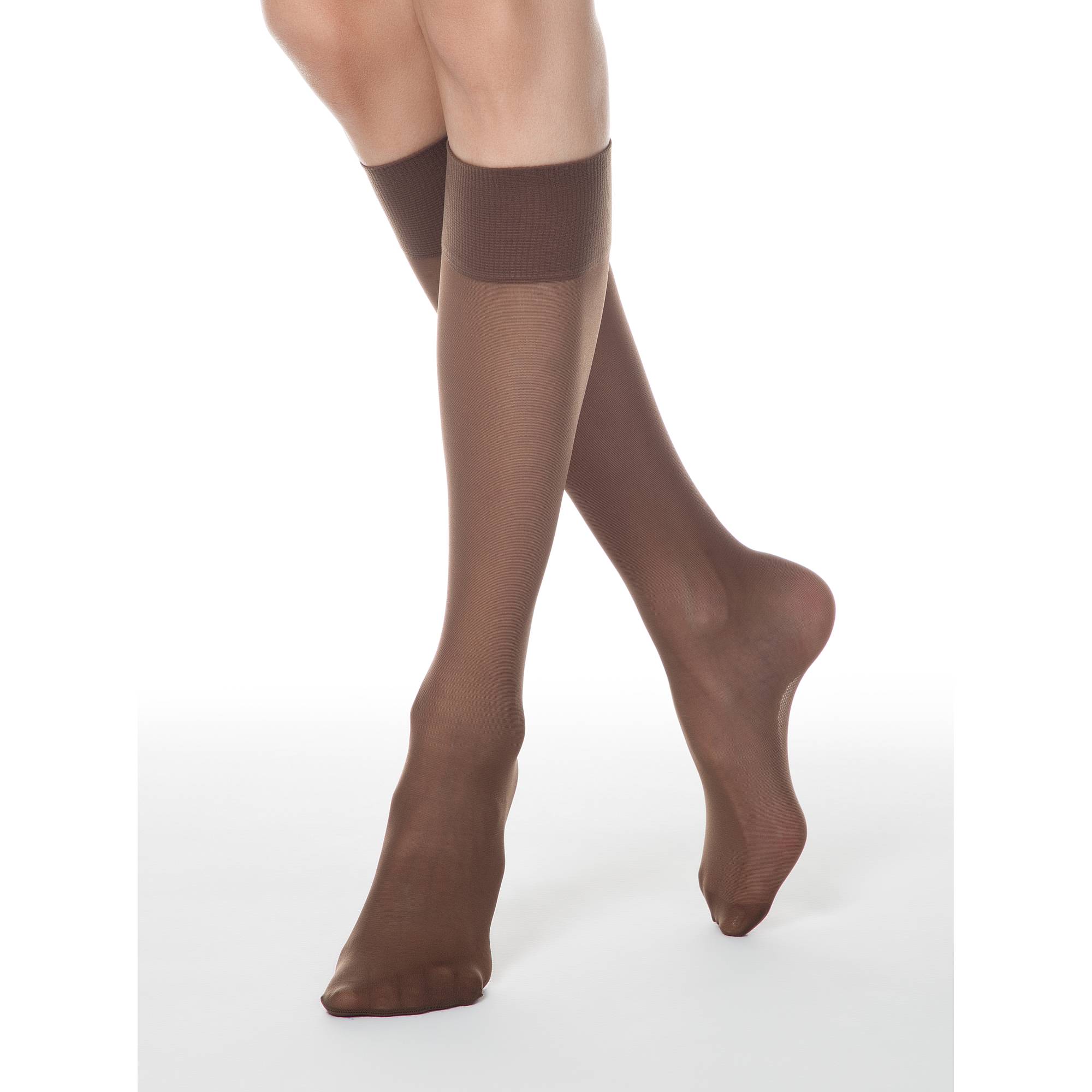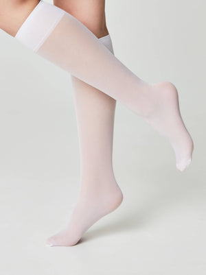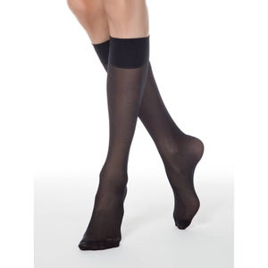 Dense elastic knee-high socks with a reinforced band, one size fits all. 2 pairs in a box