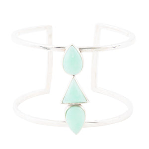 Crafted and finished by hand, this open cuff bracelet showcases genuine green chrysoprase stones in teardrop and triangle shapes placed in sterling silver bezels. With the ability to stretch or squeeze to fit most wrists, this bracelet is 1.75" in length and features a center stone of .5" at its widest point. Weighing 1.1 oz, the beautiful combination of green and silver will add a touch of elegance to any outfit. Experience the value of this statement piece today!