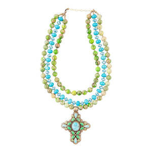 Legacy Lime Green and Blue Turquoise Golden Cross Pendant Statement Necklace