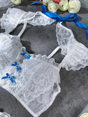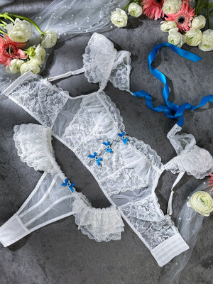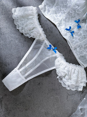 Embrace elegance and femininity with the Lily Grace Lingerie Set, a delicate combination of luxurious lace and soft satin ribbons. This stunning white set features intricate lace with a soft, romantic finish, adorned with beautiful blue satin bows. The design includes a charming ruffled trim, adding an extra touch of playfulness and elegance. The bra is designed with gentle lace cups, while the thong completes the look with its matching ruffled details.