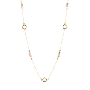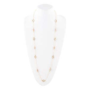 Indulge in the luxurious allure of our Long Delicate Orange Moonstone and Bronze Necklace. Made of genuine orange moonstone and golden bronze, this 40" necklace features orange stones in cylinder shapes and hammered bronze circles. Hand-crafted and weighing 20 grams, it exudes elegance and style. With a lobster clasp closure and 2" extender, it guarantees a perfect fit.
