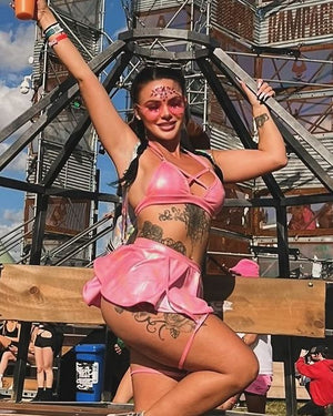 Shine bright like a diamond under the festival lights with our Metallic Iridescent Criss Cross Bikini Top! With dazzling rhinestone detailing, it's the ultimate statement piece for rave queens and festival fashionistas. Sparkle, shimmer, and stand out in style
