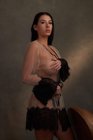 The delicate lace trim on the sheer Malia Lace Robe adds a touch of sophistication to classical feminine elegance. Injecting a little glamour into your beauty sleep or your at home loungewear the open-front Malia Lace Robe will easily become a staple in your wardrobe. The charming robe beautifully drapes over your body, flirting with your natural curves. The silky ribbon-tie allows for the fabric to perfectly fit to your figure. Leave a little something to the imagination with this bubbly lace piece, that frames your body like the work of art it is. This irresistible sheer accessory lets your bust and belly peek out to drive him crazy until bedtime. Pair it with the matching lace Malia Tanga Panty for a sexy and sophisticated look or for an even edgier combination try a strappy accessory.
