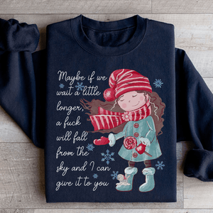 The sweatshirt features the bold, tongue-in-cheek phrase "Maybe If We Wait A Little Longer A F*ck Will Fall From The Sky" in a playful, attention-grabbing font. It's a humorous way to express your feelings on days when you're just not having it. Whether you're lounging at home or out for a casual day, this sweatshirt adds a fun and cheeky twist to your outfit.