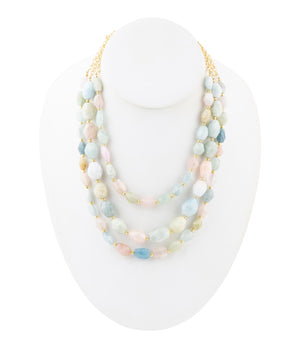 Expertly crafted and meticulously finished by hand, this necklace features three strands of gorgeous morganite beads in varying shades of pink, green, and blue, all connected by a golden brass chain. The necklace measures 16" in length and includes a 2" extender chain and a secure lobster clasp. At its widest point, the necklace is .5" and weighs a total of 3.65oz. Experience the beauty and elegance of this handmade statement piece.