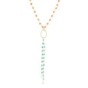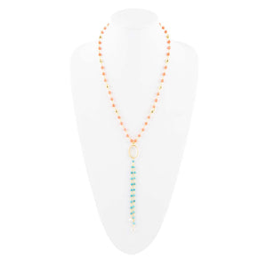 Experience the elegance of genuine coral, magnesite, and pearl with our goldtone brass necklace. With an adjustable inner length of 28" and a drop of 6.25", this necklace is versatile and lightweight at only 26grams. Elevate your style with this stunning piece!