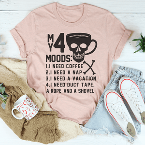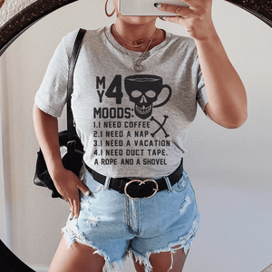 Let us introduce the "My 4 Moods" tee - a statement piece for all life's moods and moments! This tee captures the smell of fresh coffee, the silence of a power nap, the thrill of a vacation, and the humor in life’s more challenging moments. Its lighthearted print is a dash of sarcasm, a dollop of reality, and a whole lot of relatable!