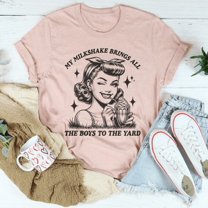 Flaunt your charm with our "My Milkshake Brings All The Boys To The Yard" t-shirt! This playful top is a cheeky throwback to one of the catchiest lines in pop culture, perfect for those who love a bit of nostalgia mixed with a good dose of humor.