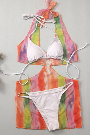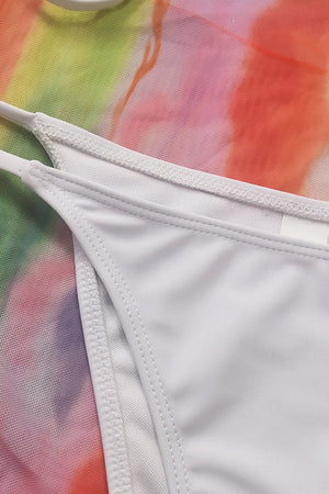 This fun and eye-catching set includes a white string bikini top, a white cheeky back bikini bottom, and a sheer neon cover up dress with side cut outs, a cinched O-ring front, and a halter neck.
