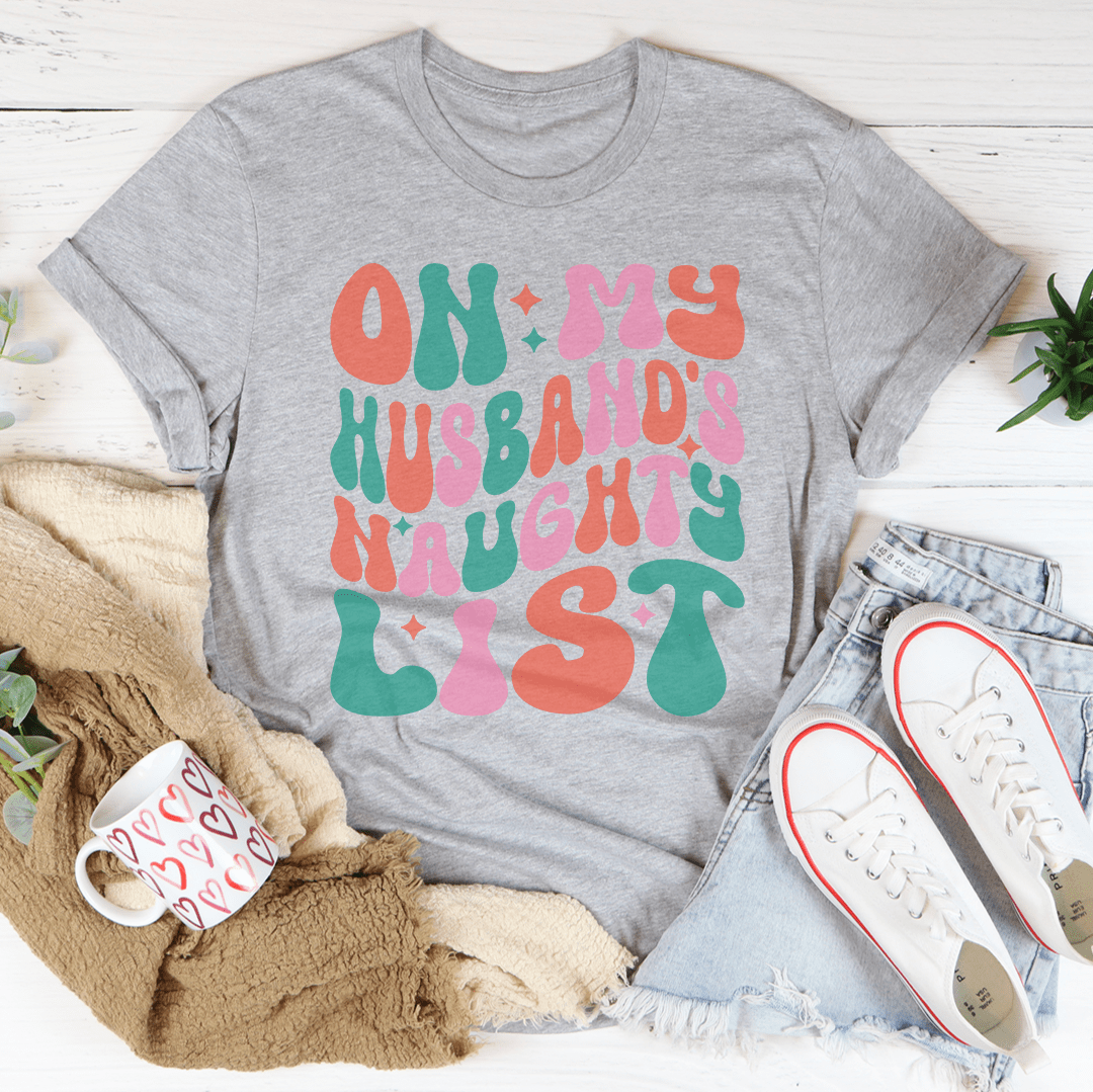 Add a playful twist to your holiday wardrobe with our "On My Husband's Naughty List" T-shirt. This cheeky tee is perfect for those who love to bring a bit of fun and flirtation to the festive season. It's a lighthearted way to embrace the holiday spirit with a personal touch that's sure to bring a smile to everyone's face, especially your husband's!