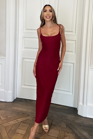 This elegant ankle-length burgundy dress is the perfect choice for holiday gatherings and special evenings. Crafted with adjustable spaghetti straps that crisscross and ties in the back. This fitted dress highlights a graceful low-back design. Made in Brazil from a blend of polyamide and spandex, it offers a sleek, comfortable fit that hugs your curves beautifully.