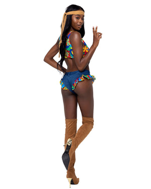 Transform into the ultimate flower child with this 4-piece Peace & Love Hippie Sexy Costume. This groovy ensemble features a vibrant tie-dye crop top with a deep v-neckline and a peace sign applique. The matching high-waisted shorts are adorned with a colorful fringe hemline, perfect for swaying to the sounds of your favorite classic rock tunes. A brown suede vest with a tassel trim adds a touch of boho-chic flair to this retro-inspired look. Complete the outfit with the included headband, featuring the same material as the fringe vest and elastic back for a comfortable fit.