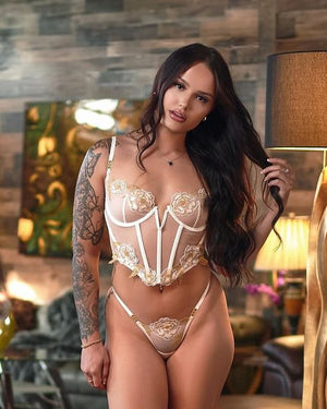 Indulge in elegance with our Peony Paradise Bridal 2-Piece Bustier lingerie set. Crafted with delicate lace and adorned with intricate floral details, this ensemble embodies romance. The bustier offers a flattering silhouette, while the matching panties complete the look with grace and allure. Flaunt your femininity on your special day