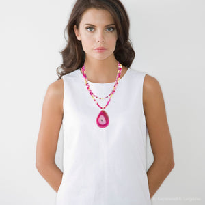 Indulge yourself with this exquisite Pink Agate Golden Pendant Necklace, featuring two strands of gleaming golden hematite and genuine pink agate beads. At 18.25" in length, with a 2" chain extender and secure lobster clasp, it is the perfect accessory for any occasion. Hand-crafted and beautifully finished, this necklace boasts a stunning 2.5" long pendant made of genuine pink agate, measuring 1.62" at its widest point, and weighing a total of 69.45g. Be inspired by its luxurious design and add it to your collection today!