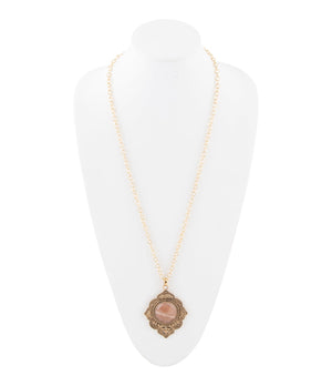 This handcrafted pendant necklace features a beautiful 31.5" golden bronze chain and a lobster clasp. The hanging pendant, made of a circular pink moonstone stone surrounded by intricate golden bronze detail, measures 3.25" in length and 2.26" at its widest point. With a total weight of 64.63g, it is truly a stunning and unique piece.