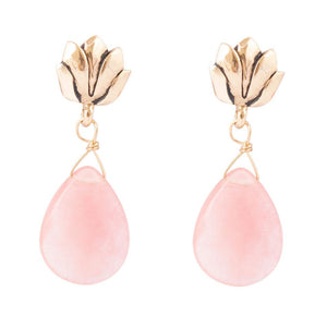 Indulge in the vibrant energy of these Pink Quartz Golden Lotus Drop Earrings, handcrafted with a stunning genuine pink quartz stone in a tear drop shape and adorned with a beautiful golden bronze lotus flower design. Measuring 1.25" long and 0.5" wide at its widest point, these earrings weigh a total of 4.35g, making them a delicate and elegant addition to your jewelry collection. Let these earrings be a reminder of the natural beauty and spirituality they represent.