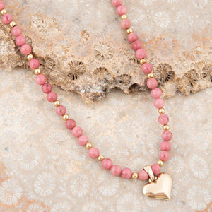 Pink Rhodonite and Golden Bronze Heart Pendant Necklace