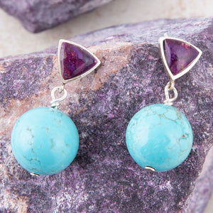 Handcrafted and finished with care, these Prescott Purple Turquoise Sterling Silver Earrings feature a genuine purple turquoise triangle stone paired with a genuine blue magnesite sphere stone. These gorgeous drops measure 1.25" in length from ear wire and .50" at their widest point, with a total weight of 9.8g. Made of high-quality sterling silver.