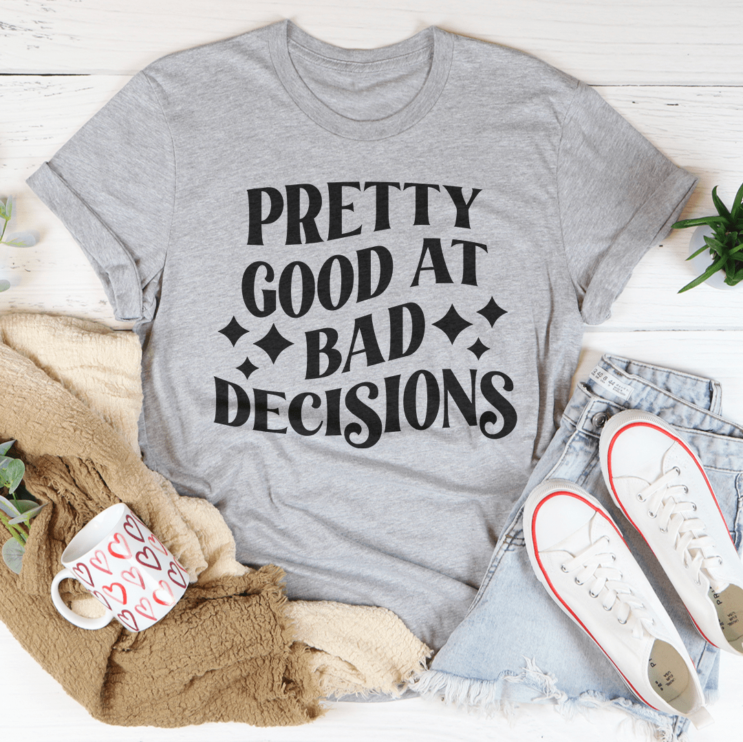 Show off your playful side with our "Pretty Good At Bad Decisions" t-shirt. Perfect for those who own their flaws with confidence and humor, this tee is ideal for casual outings, get-togethers with friends, or just lounging at home. It’s a fun way to share your relatable sense of humor with the world.