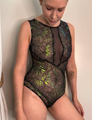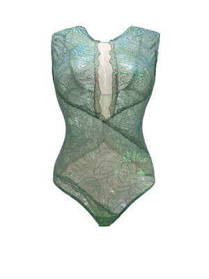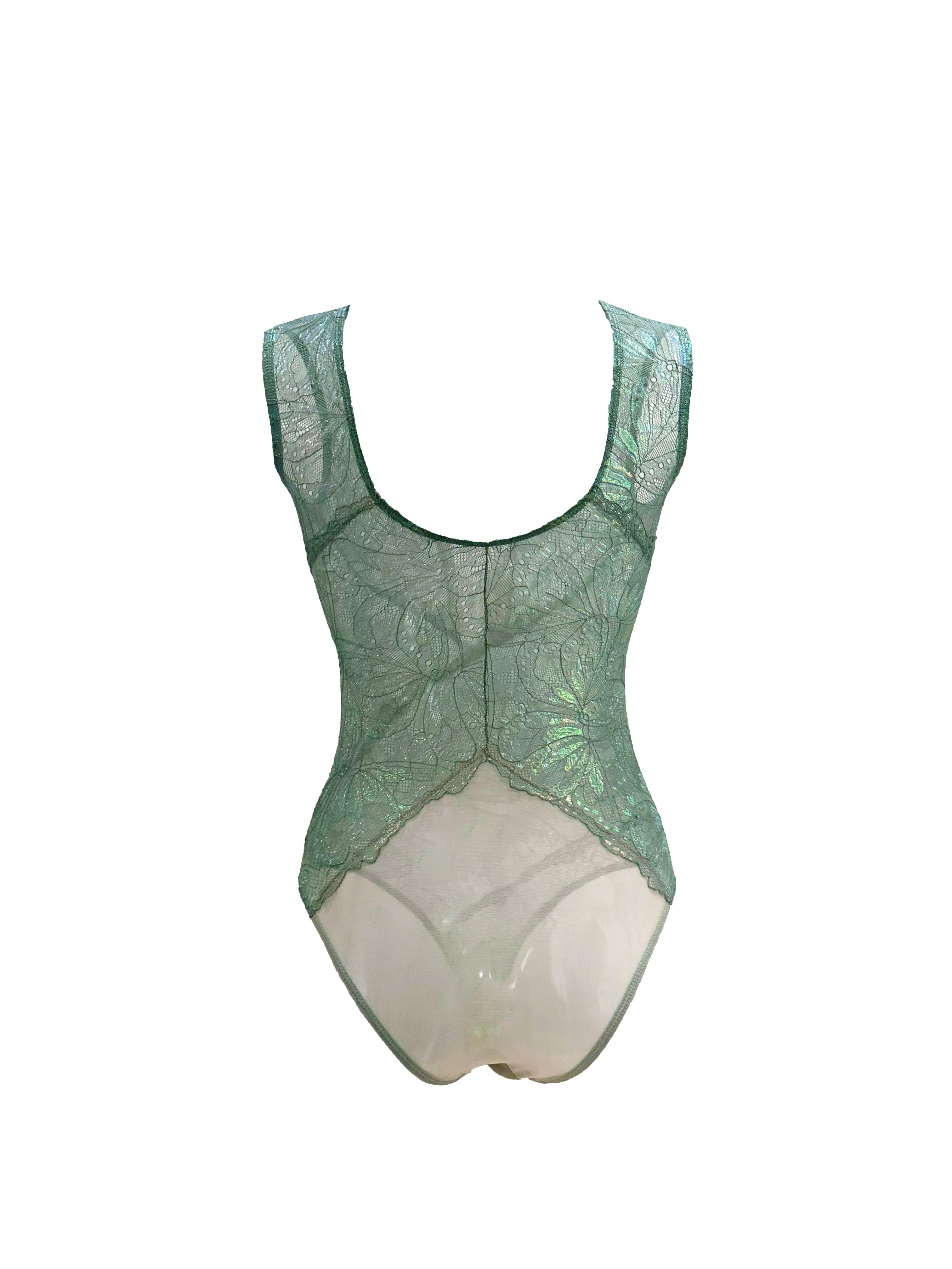 Experience the magic of our Psyche Iridescent Sleeveless Bodysuit and shine bright like a diamond. Made with metallic stretch lace for a comfortable fit, the sheer mesh detail and higher back neckline add a touch of elegance and makes this style ready-to-wear outside the bedroom. With an adjustable inner thigh hook and eye, this bra-friendly bodysuit is available in both standard and boost sizes in color Green and Black.
