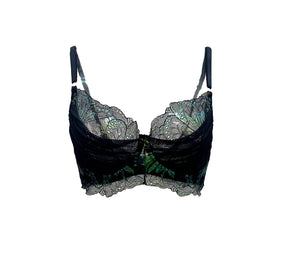 Introducing the Psyche Underwire Draped Bra, featuring iridescent stretch lace and mesh tulle for a luxurious and flattering neckline. This full coverage bra also offers a unique draped detail around the cup that can be worn as a shelf feature for added style. Elevate your lingerie collection with this elegant and versatile piece.
