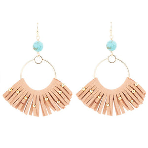Exude a sense of style and grace with these breathtaking Pueblo Blue Magnesite Golden Fringe Earrings. Each intricately crafted earring features a round blue magnesite stone set in radiant golden brass, adorned with fabric frills. With a weight of 3.1g each, a length of 3 inches, and a width of 2 inches at it's widest point these earrings are the perfect size to make a statement without overwhelming your look. Every aspect of these earrings, from the handcrafted details to the flawless finish, exudes passion and artistry.